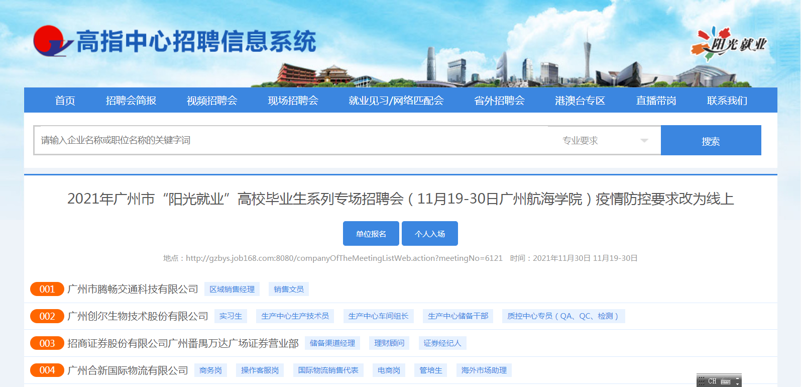 由 广 州 市 高 校 毕 业 生 就 业 指 导 中 心 主 办 的 2 0 2 1 年 广 州 市 “ 阳 光 就 业 ” 高 校 毕 业 生 系 列 专 场 招 聘 会 - - - 广 州 航 海 学 院 专 场 , 于 1 1 月 19 号 到 30 号 在 线 上 举 办 , 链 接 地 址 : http://gzbys.job168.com:8080/companyOfTheMeetingListWeb.action?meetingNo=6121