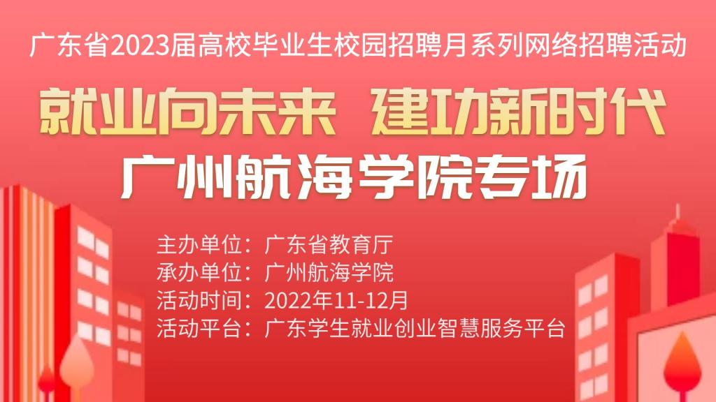 为深入学习贯彻党的二十大精神,落实党中央、国务院“稳就业”“保就业”决策部署,按照教育部办公厅《关于开展2023届高校毕业生校园招聘月系列活动的通知》要求,广东省教育厅会同全省高校,依托广东学生就业创业智慧服务平台(以下简称“平台”)开展主题为“就业向未来 建功新时代”的广东省2023届高校毕业生“校园招聘月”系列网络招聘活动,诚邀广大用人单位参加本次招聘活动,活动具体安排如下: