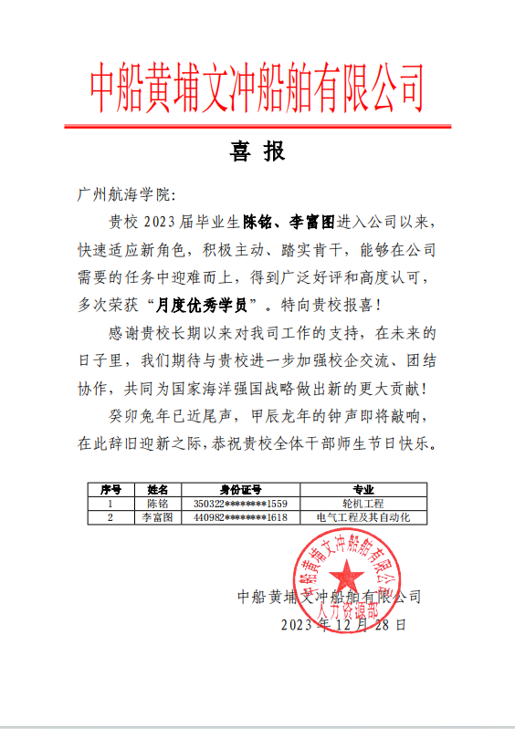 12月28日,我校收到中船黄埔文冲船舶有限公司发来的喜报,轮机工程学院和船舶与海洋工程学院2023届毕业生陈铭、李富图因工作表现出色,“积极主动、踏实肯干”,得到公司高度认可,多次荣获“月度优秀学员”。特向我校报喜!