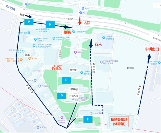 从明胜m88官网黄埔校区北门进学校南区后停车场分布及到达现场线路图见下图