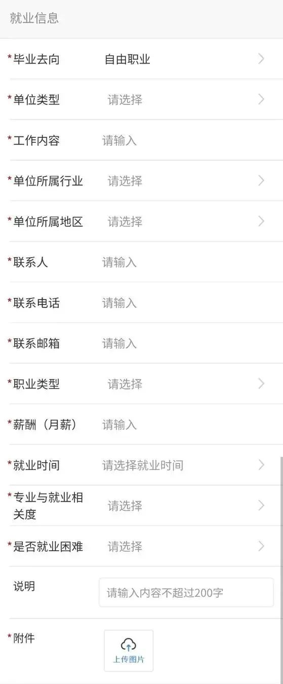 系统填写页面红色标星字段都为必填,请按照字段填写说明(附件1)和要求操作(附件2),毕业去向类型为“自由职业”须回传毕业生本人签名确认的自由职业去向说明(模板详见附件3)。