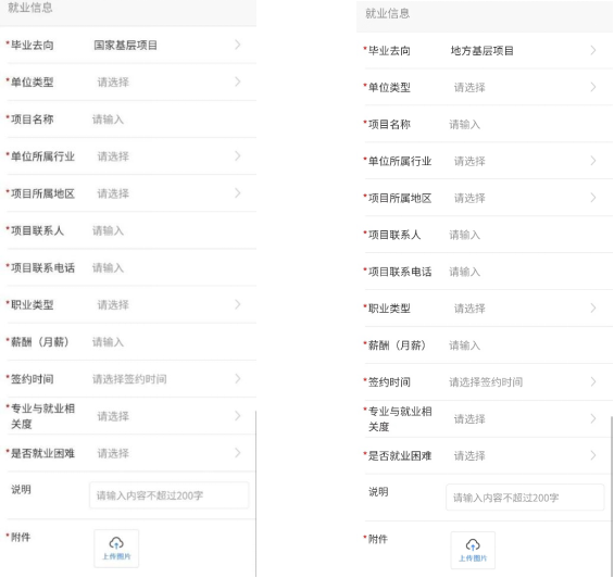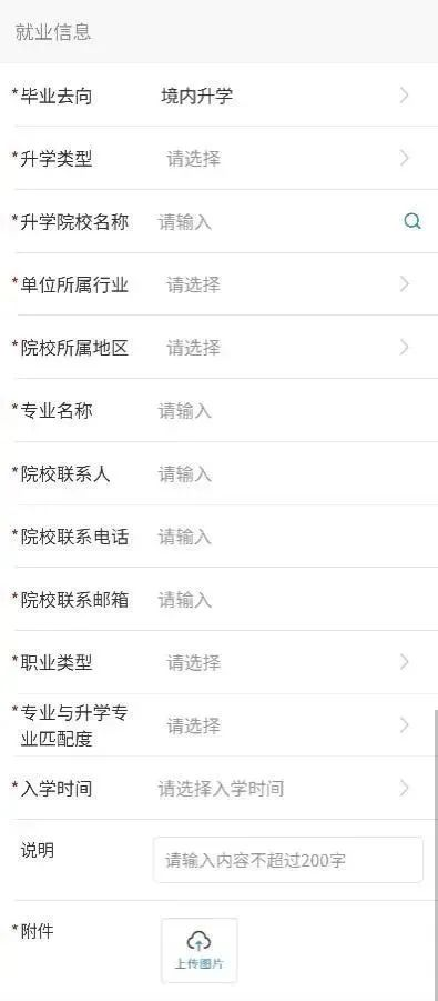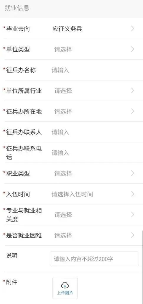 已经被征选义务兵的毕业生,毕业去向类型选择“应征义务兵”。相关内容填写要求如下: