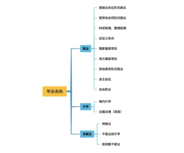 毕业去向登记类别含有“就业”“升学”“未就业”三大类14小类,详见下图。