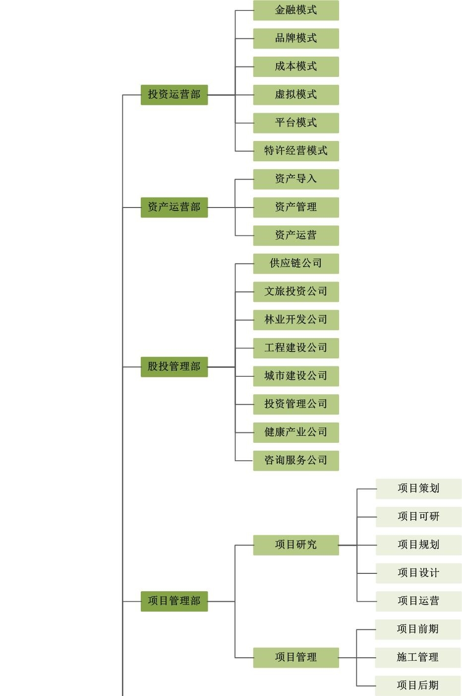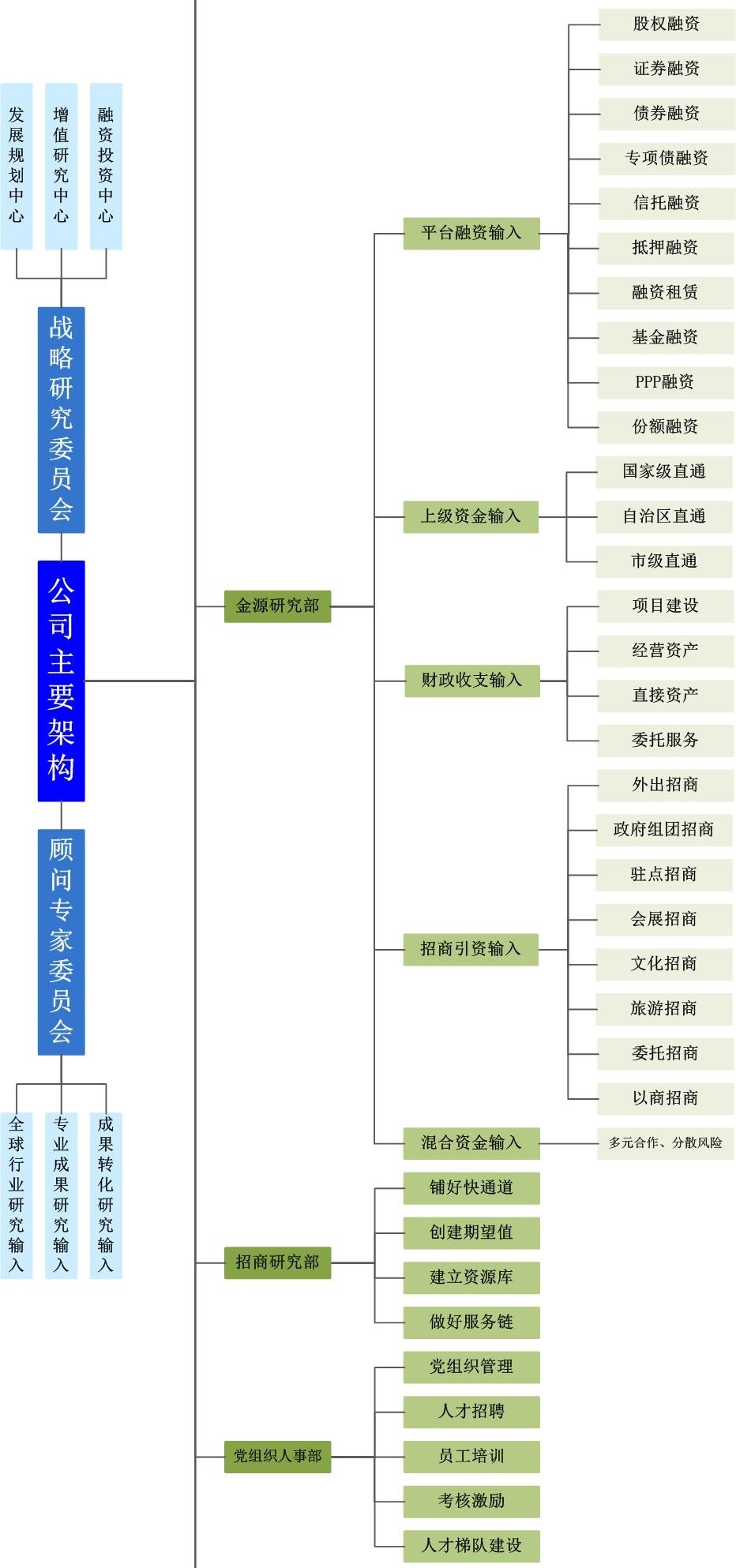 组织机构:专家委员会、战略研究委员会、高管层及金源研究部、综合事务部、项目部、招商研究部、行政后勤部、人力资源部、财务审计部、资产运营部、股投管理部、投资运营部等10个部门。