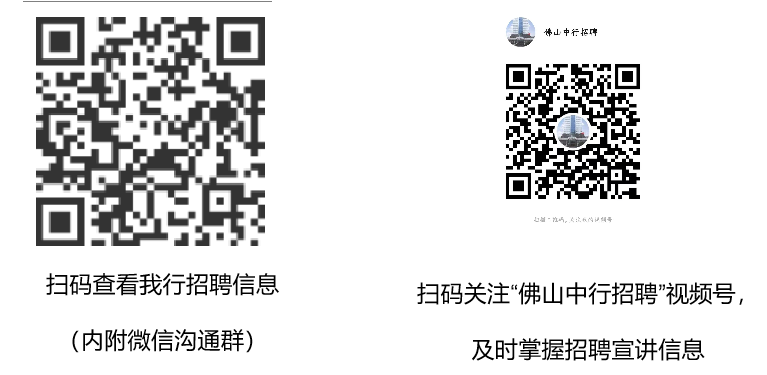 扫码关注我行官方招聘视频号“佛山中行招聘”,我行将于近期通过视频号开展线上宣讲会直播,欢迎大家扫码关注并观看,宣讲直播日期安排如下: