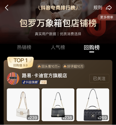 三年内,凭借高品质的产品、优秀的客户服务和值得信赖的销售态度,#路易卡迪 在抖音平台的话题累计播放量超过20亿,快速收获超过500万粉丝,并且路易·卡迪官方旗舰店的口碑分长期维持满分5分,产品、服务、物流各方面都达到超高标准,稳居抖音平台箱包回购榜排行Top1,抖音箱包品牌全年Top5,多款包包进入各类爆款排行榜。